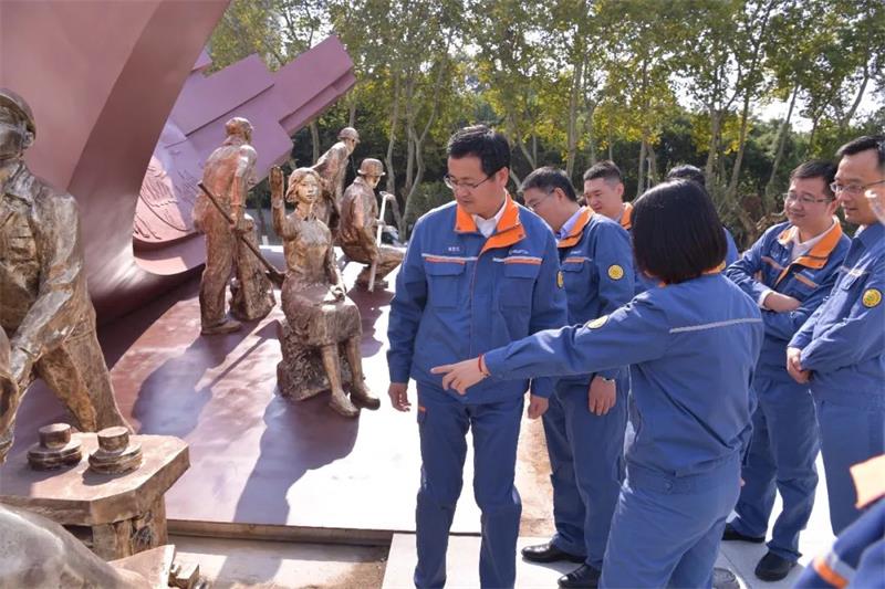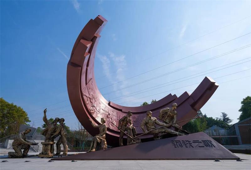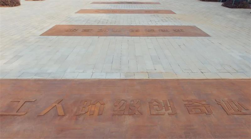 Standing in the middle of the square is a sculpture with the theme of "Song of Iron and Steel". The main shape is part of the blast furnace shell of the iconic steel smelting equipment, and below is a crowd of dedicated steel workers. The square in front of the sculpture is paved with ground carvings representing the five important development stages of Meishan Iron and Steel. The ground carvings are based on the staff and compose a magnificent "Song of Steel" together with the theme sculpture.